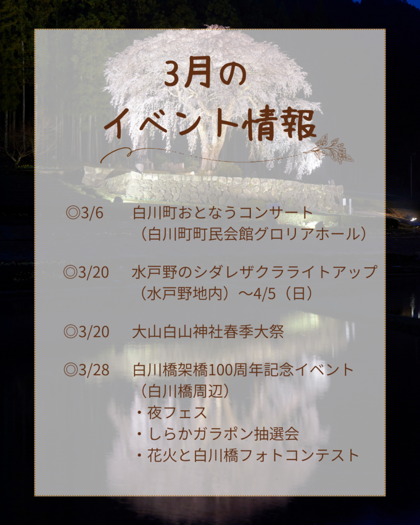 白川町では、3月も音楽公演や伝統行事、春の風物詩など、多彩な催しが開催されます。